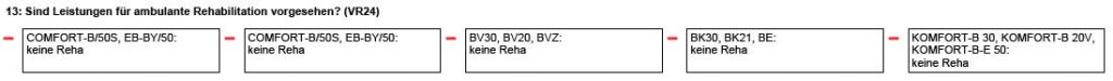 Erklärung: Das Spezifikum hier ist, dass sie nur bei bestimmten Erkrankungen grundsätzlich möglich ist und jene im direkten Anschluss (spätestens zwei Wochen nach der Entlassung) durchgeführt wird. Eine ambulante Heilbehandlung hat das Ziel, dass die Patienten alle verlorengegangenen Fähigkeiten zurückgewinnen und volle Alltagstauglichkeit wieder erlangt wird. Dauer sind in der Regel 15 Tage. Ist Dir das Thema „Ambulante Rehabilitation“ wichtig, solltest Du diese Leistung auch auswählen.