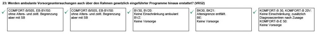 Erklärung: Vorsorgeuntersuchung heißt, dass man sich untersuchen lässt, ob alles in Ordnung ist. Dies bieten die meisten privaten Versicherer an. Natürlich auch aus Eigennutzen, um kostenintensive, teure Behandlungen sich ersparen zu können. Ist Dir diese Leistung wichtig, achte eventuell darauf, dass hier kein Selbstbehalt fällig wird.