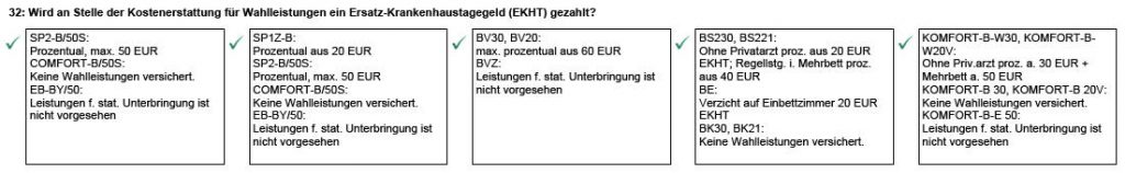 Erklärung: Finde ich nicht so wichtig, sondern eher als Beiwerk. Denn zum Ersten gibt es für 300 € in zwei Kalenderjahren normalerweise keine Top-Brillen samt Gläsern. Und zum Zweiten sind die Privaten Krankenversicherer hier in der Zahlung zurückhaltend, weil es natürlich jeden Tarif kaputtmachen würde, wenn sich jeder Kunde im Jahr für zum Beispiel 1.000 € eine Sehhilfe oder Kontaktlinsen bezahlen lassen könnte.